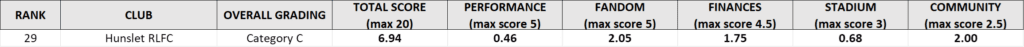 Some six months down the line, Hunslet have been less than impressed by their ‘score’ as allocated by IMG. Their total of 6.94 (from a possible 20) comprises: