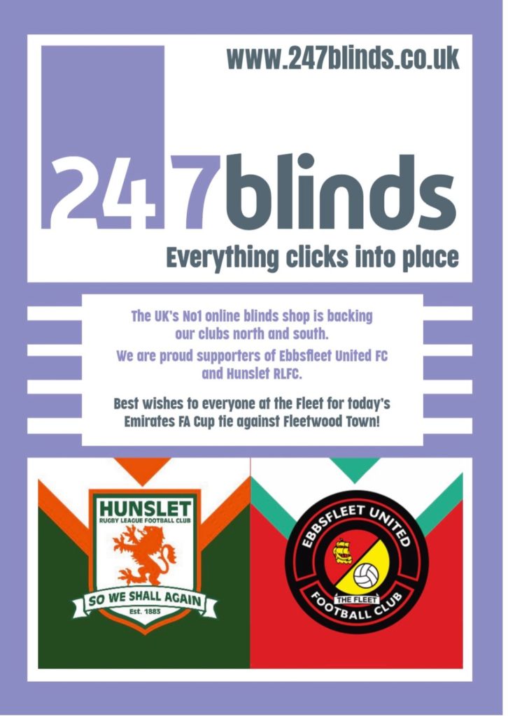Jason Peterkin of Hunslet’s main sponsor J247Blinds has taken out pitch perimeter advertising for Ebbsfleet’s big tie and, in a nice gesture which illustrates the close bond between the clubs, United will also prominently display, in front of millions of viewers, the Parksiders’ branding across their Stonebridge Road stadium.