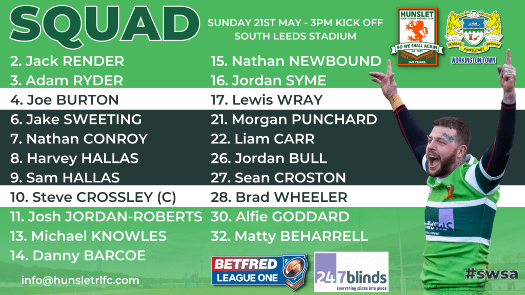 Hunslet (against Workington Town, Sunday 21 May, 3.00pm, at the South Leeds Stadium), from: Jack Render, Adam Ryder, Joe Burton, Jake Sweeting, Nathan Conroy, Harvey Hallas, Sam Hallas, Steve Crossley, Josh Jordan-Roberts, Michael Knowles, Danny Barcoe, Nathan Newbound, Jordan Syme, Lewis Wray, Morgan Punchard, Liam Carr, Jordan Bull, Sean Croston, Brad Wheeler, Alfie Goddard, Matty Beharrell.