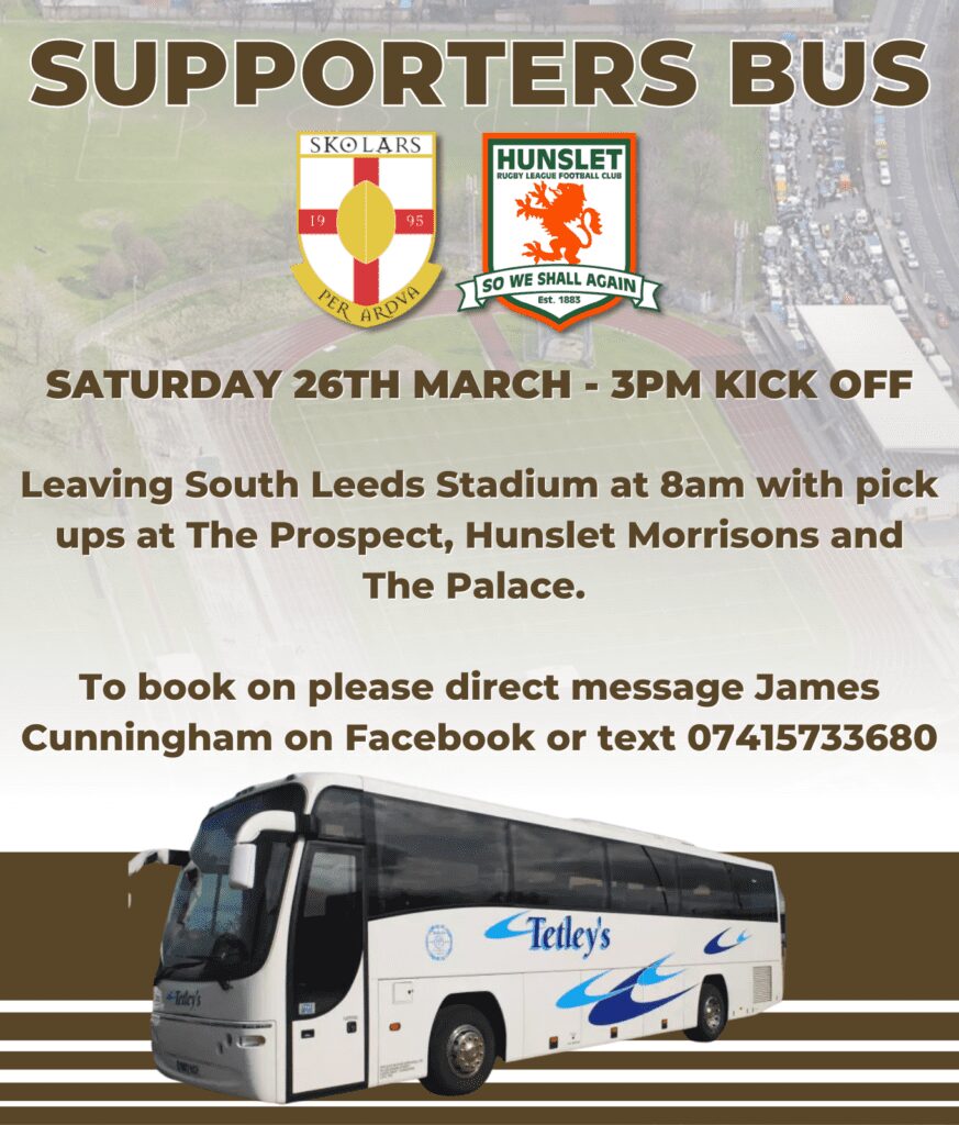 James Cunningham is organising a supporters’ bus to our opening game of the Betfred League One season as we travel to London to take on the London Skolars. The game will take place on Saturday 26th March (3pm kick off) and the bus will be leaving South Leeds Stadium at 8am with pick ups at The Prospect, Hunslet Morrisons and The Palace. To book on please direct message James on Facebook or call / text 07415733680