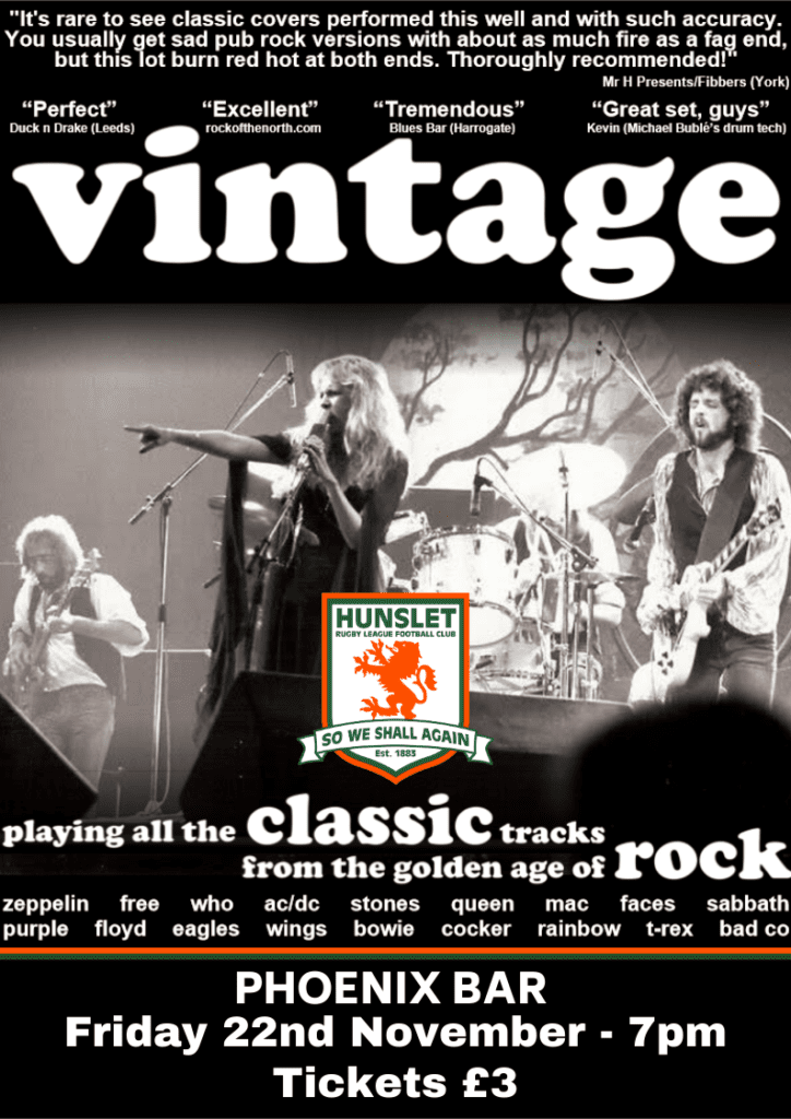 Rock band ‘Vintage’ will be live in the Phoenix Bar on Friday 22nd November, playing all the classic tracks from the golden age of rock. Tickets £3.