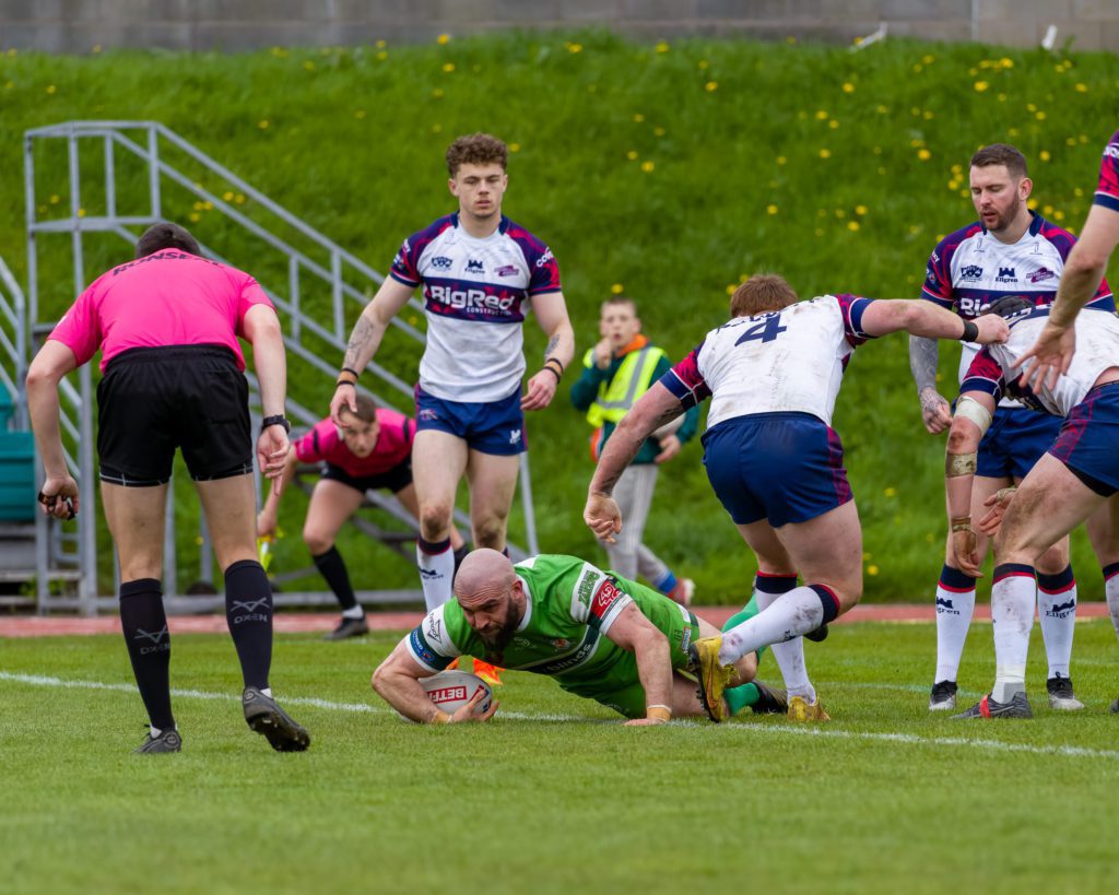 On 10 minutes Sam Hallas combined with Harvey Hallas who powered over and with Beharrell’s conversion the hosts lead 10-0, then on the 20th minute a Beharrell kick was fielded by Jordan Syme to stretch the lead to 16-0.