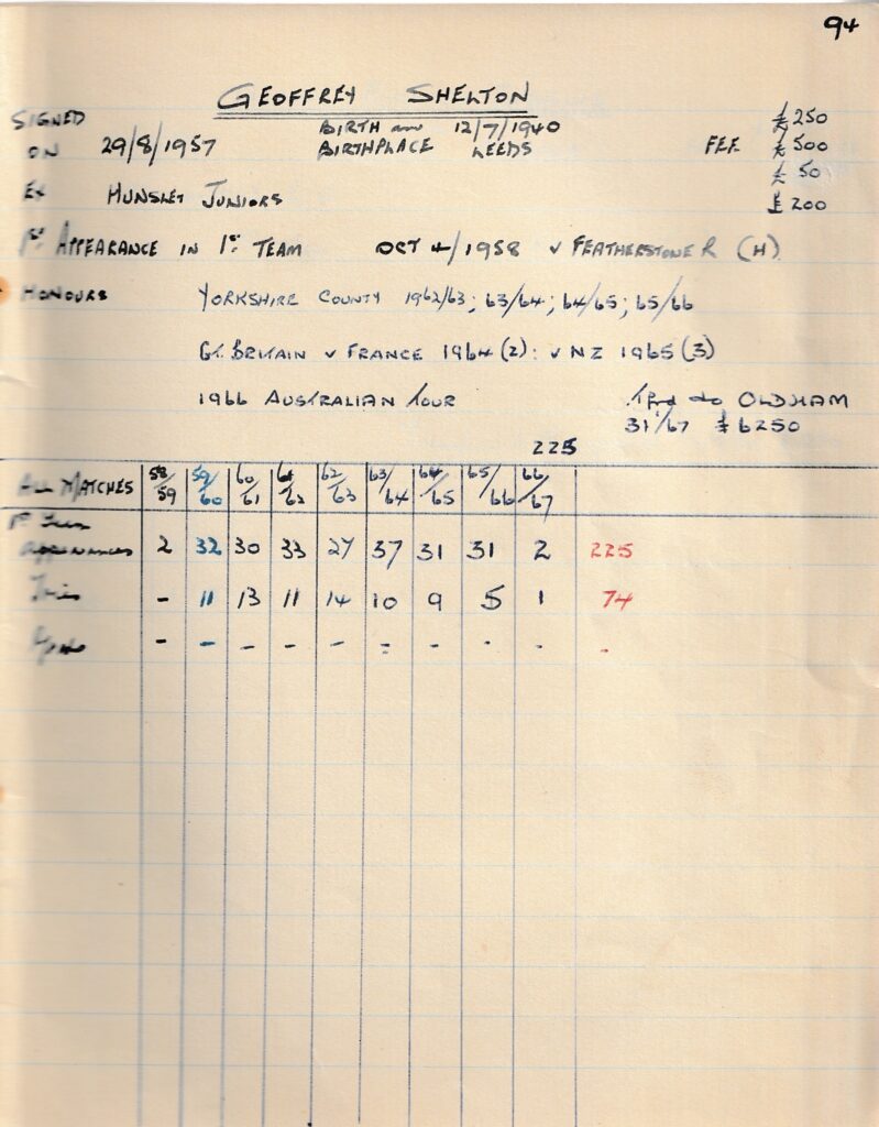 We covered Geoff Shelton’s departure a few days ago. Today in 1957 was the day he signed on. Harry Jepson’s signings ledger tells us he signed from Hunslet Juniors for £500 but this increased to £1,000 as he achieved various milestones in his career. The fee received from Oldham for his transfer was £6,250.