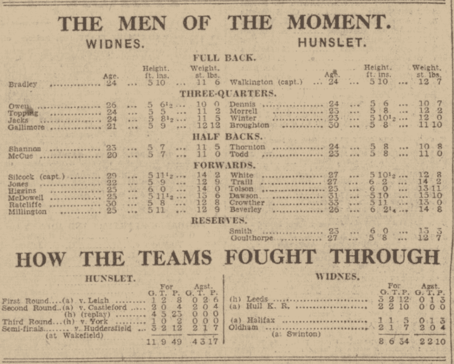 41,280 attended and saw Cyril Morrell open the scoring on 26 minutes, but he broke his collarbone as he was tackled on the line and had to leave for hospital. Loose forward Harry Beverley took his place and it was five forwards against six. It was 5-3 to Hunslet at half-time and in the second half Harry Beverley scored from a Dolly Dawson pass and Len Smith when, expected to pass to his winger, drove to the line and scored before the Widnes defenders reacted. The first Challenge Cup success since 1908 had been achieved.