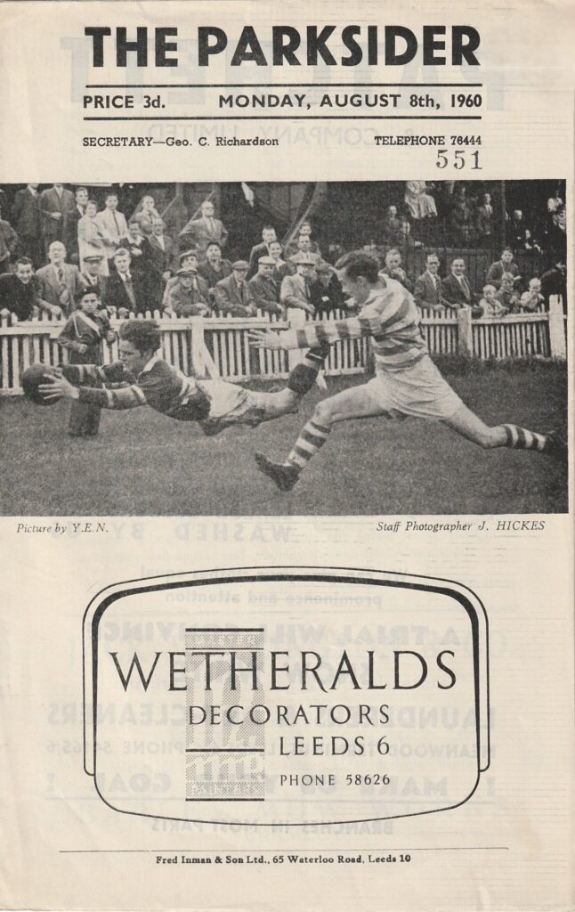 It was the 1960 Lazenby Cup at Parkside tonight. The programme notes announced that after 33 years service to the club Jack Walkington was to step aside due to business commitments, Brian Shaw was to continue as club captain and Dolly Dawson and assitant Jack Booth would be doing the coaching. Former player Jack had the reins of the Juniors and Intermediates over the last few seasons and met with some success on the field and in producing talented first teamers. The signing of three experienced players in Wilf Adams from Wakefield, Stan Moyser from Dewsbury and Vic KInsey from Featherstone was noted. It was also announced that a long planned new road from Dewsbury Road down to the ground was finally going to be completed. The “A” team would compete in the Yorkshire Senior Competition and the Rugby League Combination which would give them three fixtures in Lancashire. Hunslet retained the Lazenby Cup with a 17-10 win.