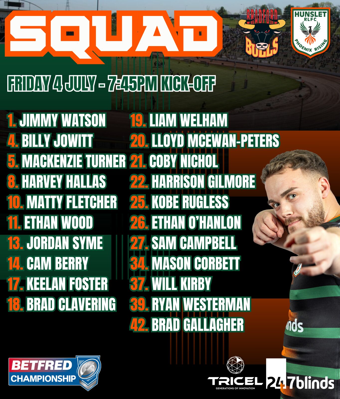 Kobe Rugless is included following a loan spell at Salford Red Devils as is new loan signing Brad Gallagher. Lee Gaskell misses out after sustaining an injury in our defeat to London Broncos.