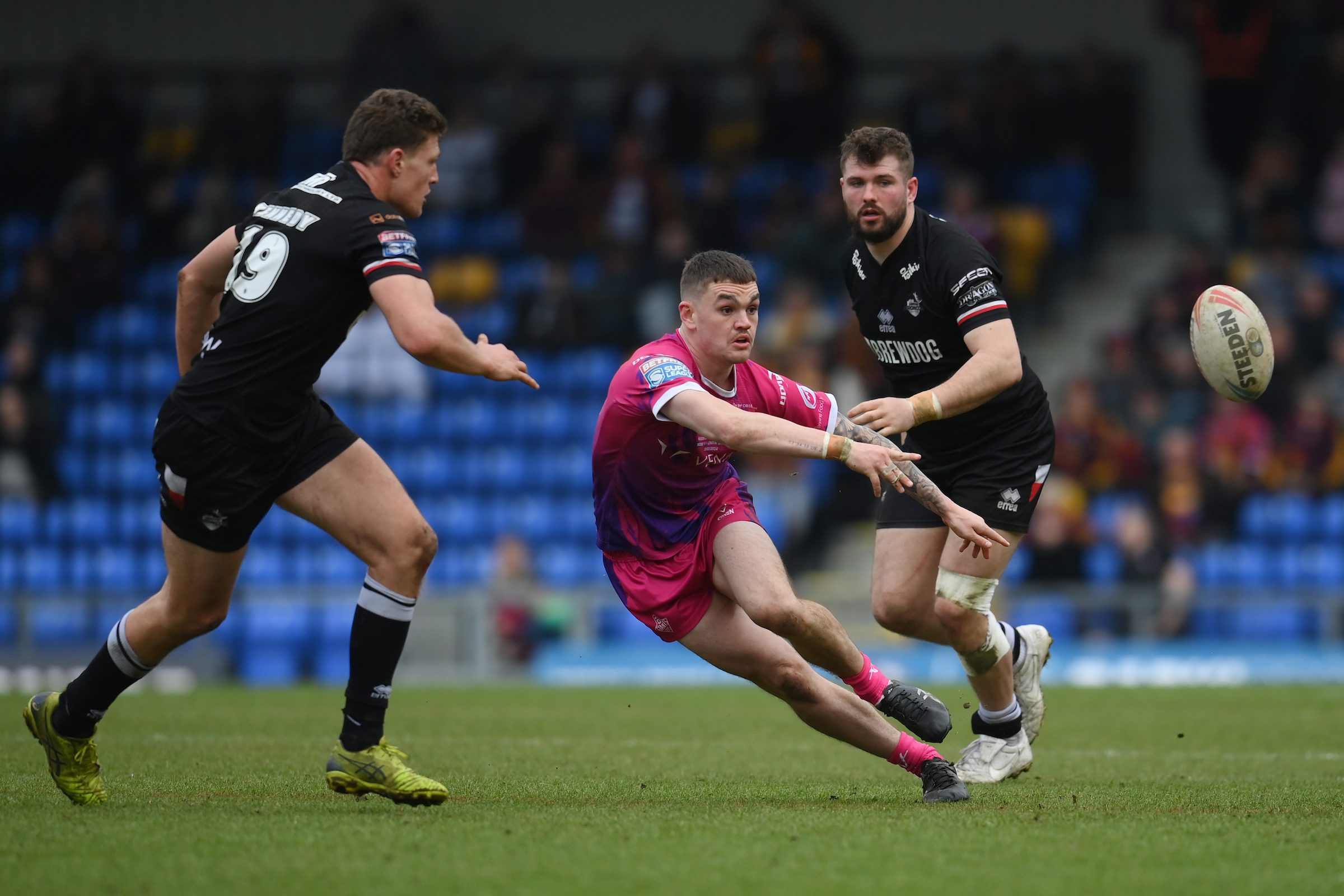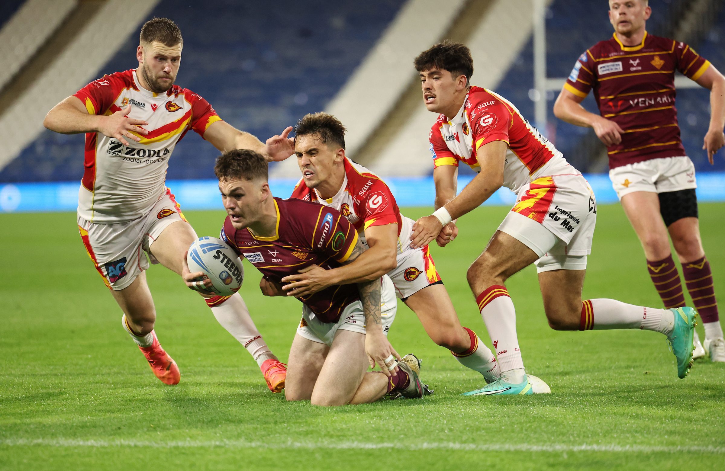 Huddersfield Giants’ Thomas Deakin in action with Catalans Dragons’ Bayley Sironen
