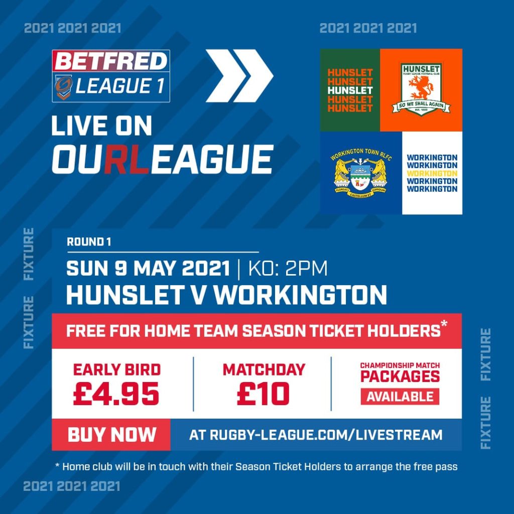 The match with Workington Town at the South Leeds Stadium on Sunday 9 May is to start at 2.00pm, rather than 3.00pm, to facilitate live streaming. And the fixture at North Wales Crusaders seven days later will kick off at 2.30pm.