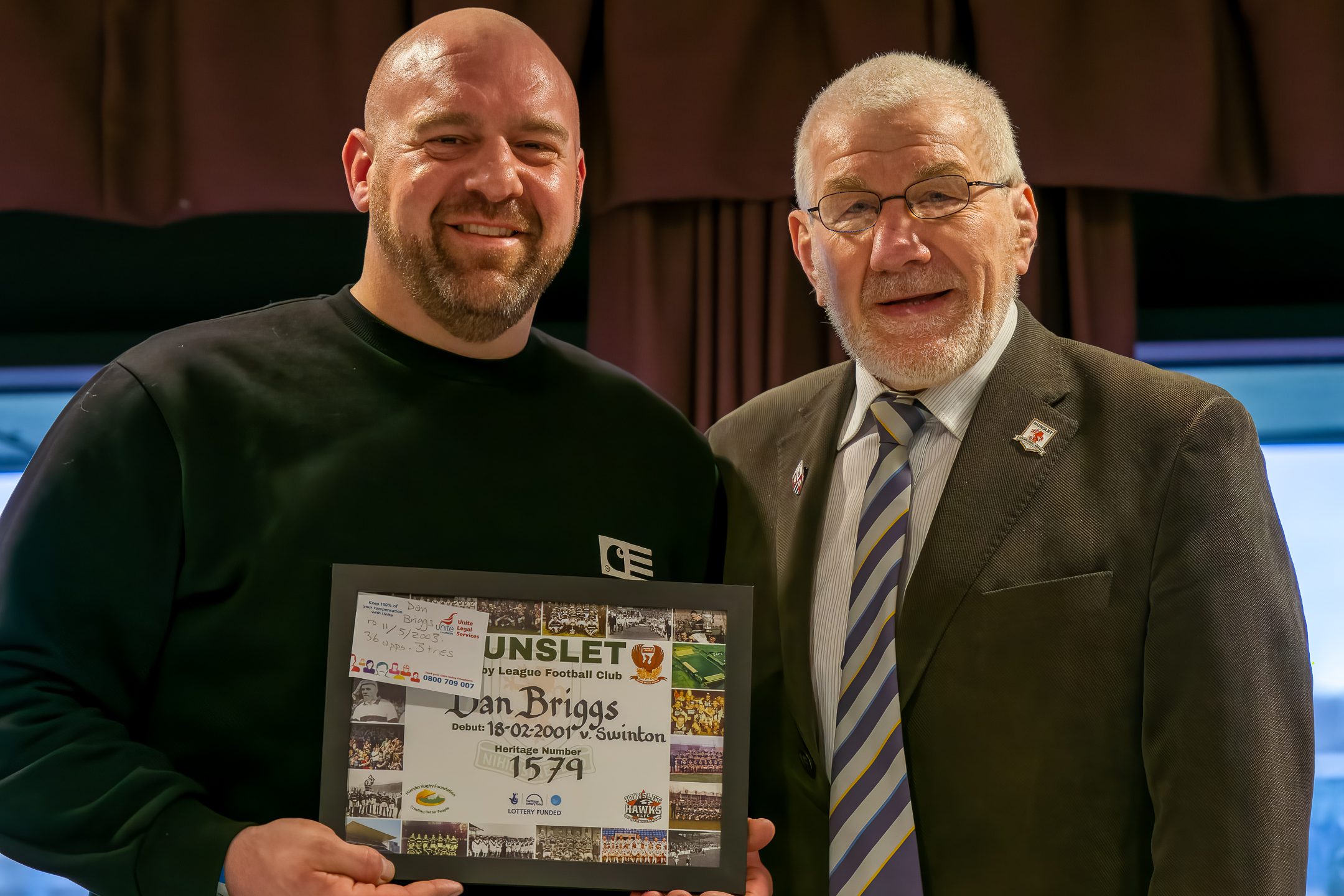 DAN BRIGGS and Liam Watling were presented with their Hunslet Rugby League heritage certificates following the Parksiders’ victory over Heworth on Sunday in the Betfred Challenge Cup.