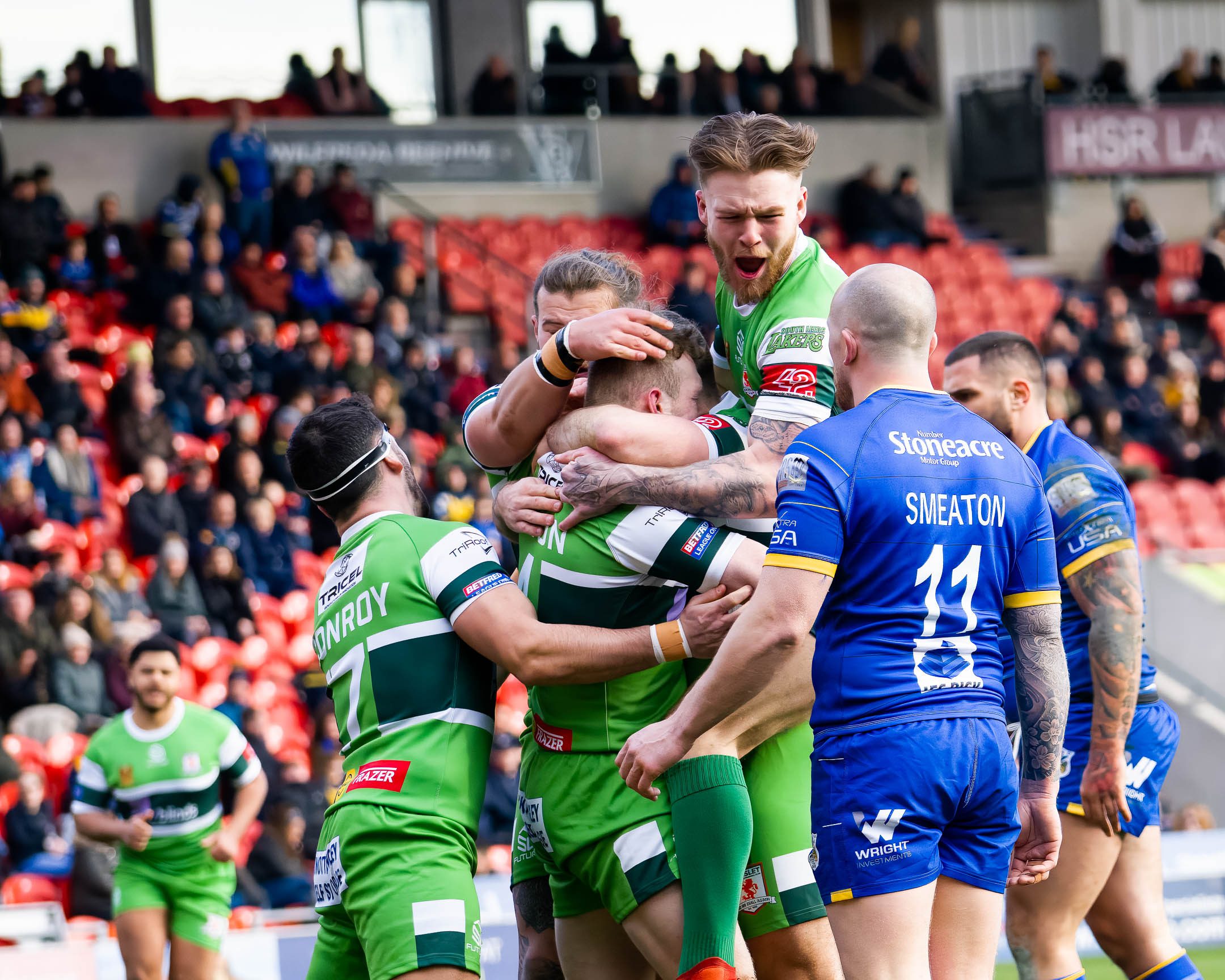 Jake Sweeting put a spiralling bomb in the air and Doncasters defenders didn’t get anywhere near it, Sam Hallas swept it up and sent Daniel Barcoe on a run. Although the ball went to ground a Dons player got a boot to it, but it went to Jack Render who scored to put Hunslet within 2 points.