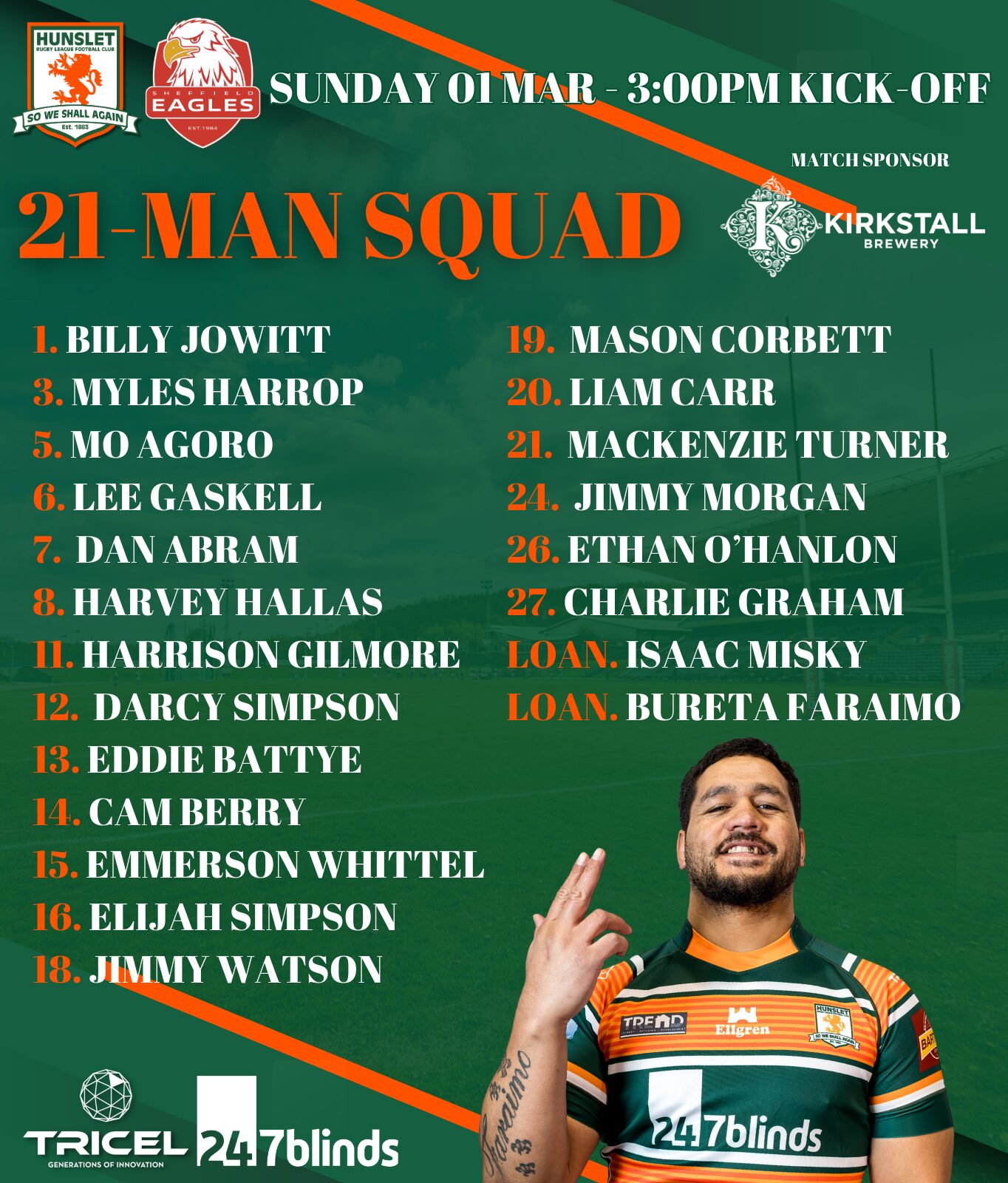 The match is sponsored by Kirkstall Brewery.