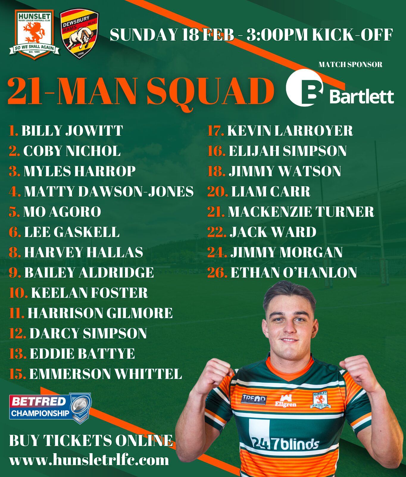 Sunday’s match is kindly sponsored by Bartlett.